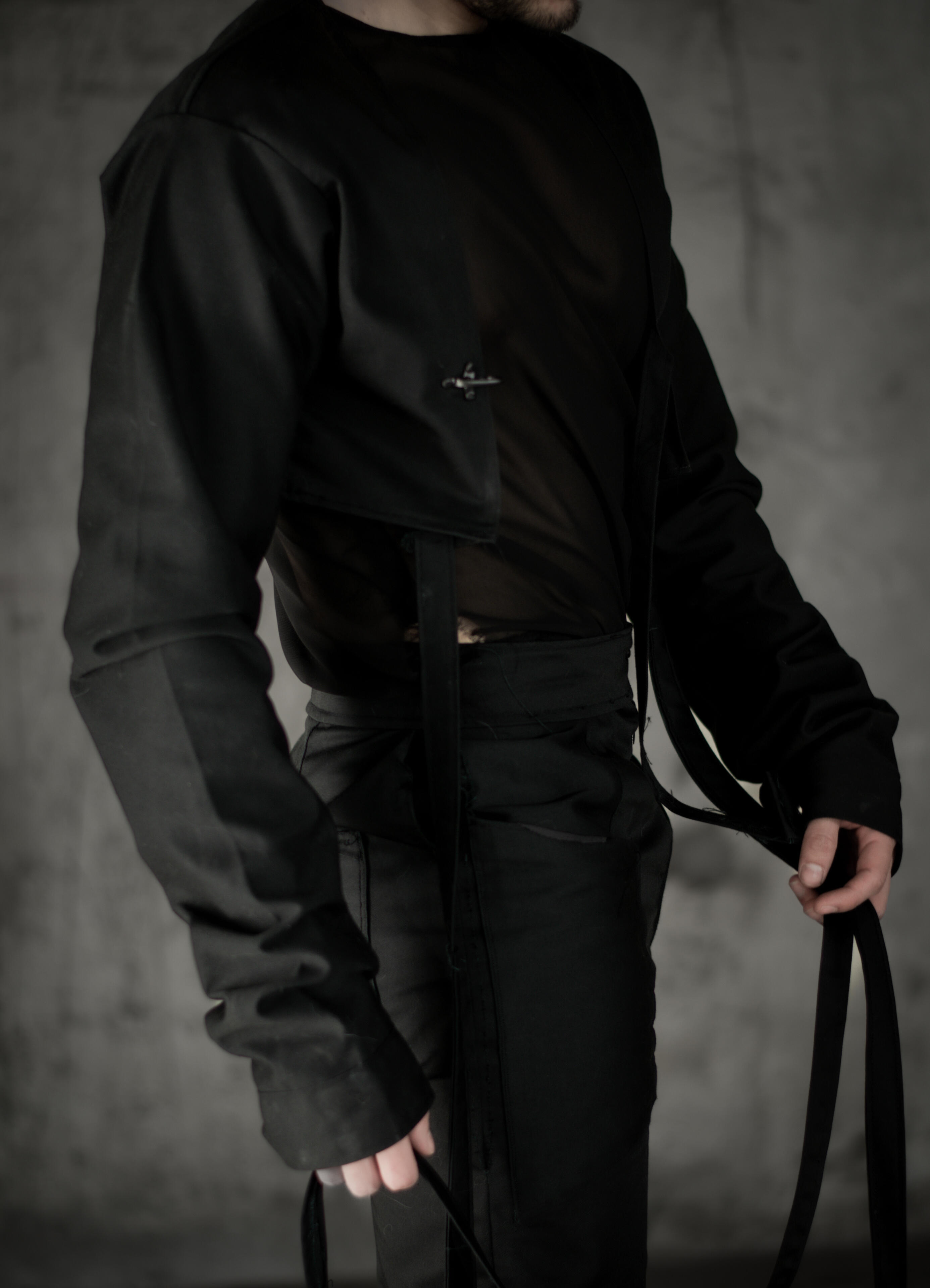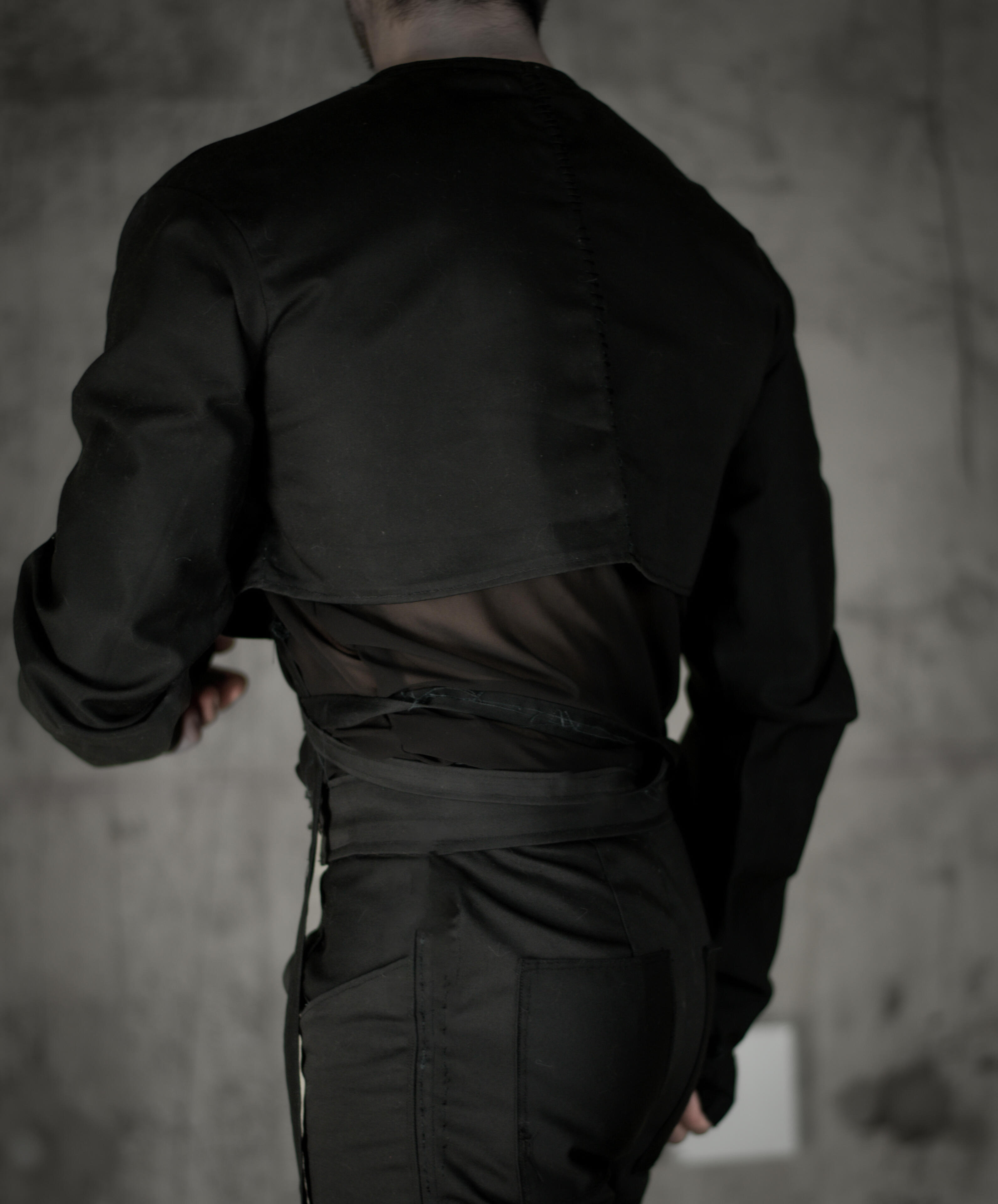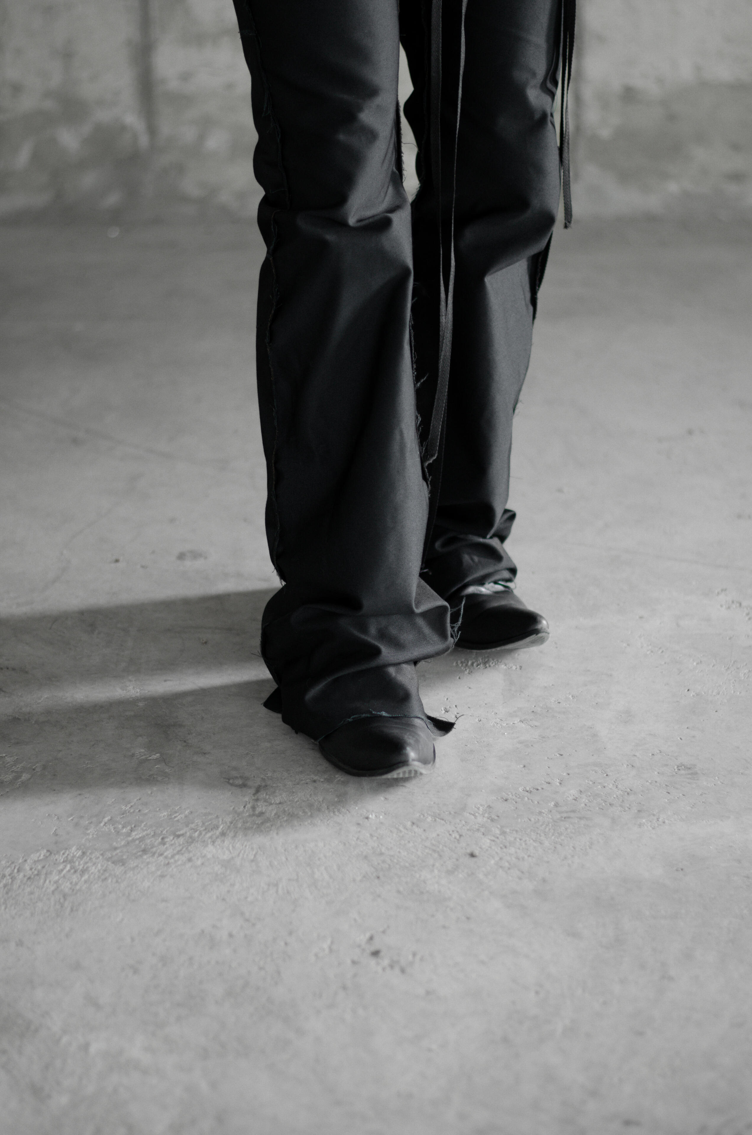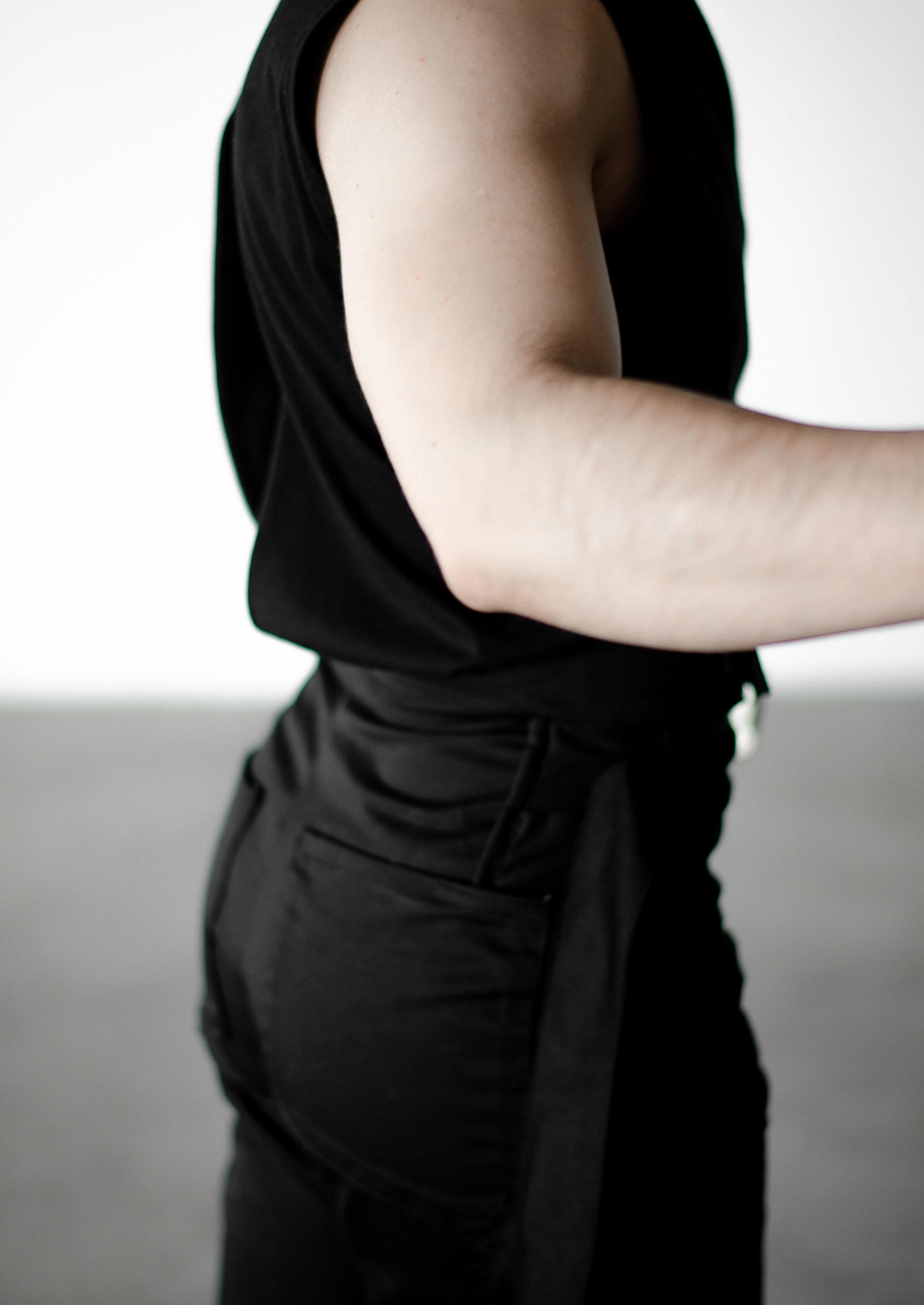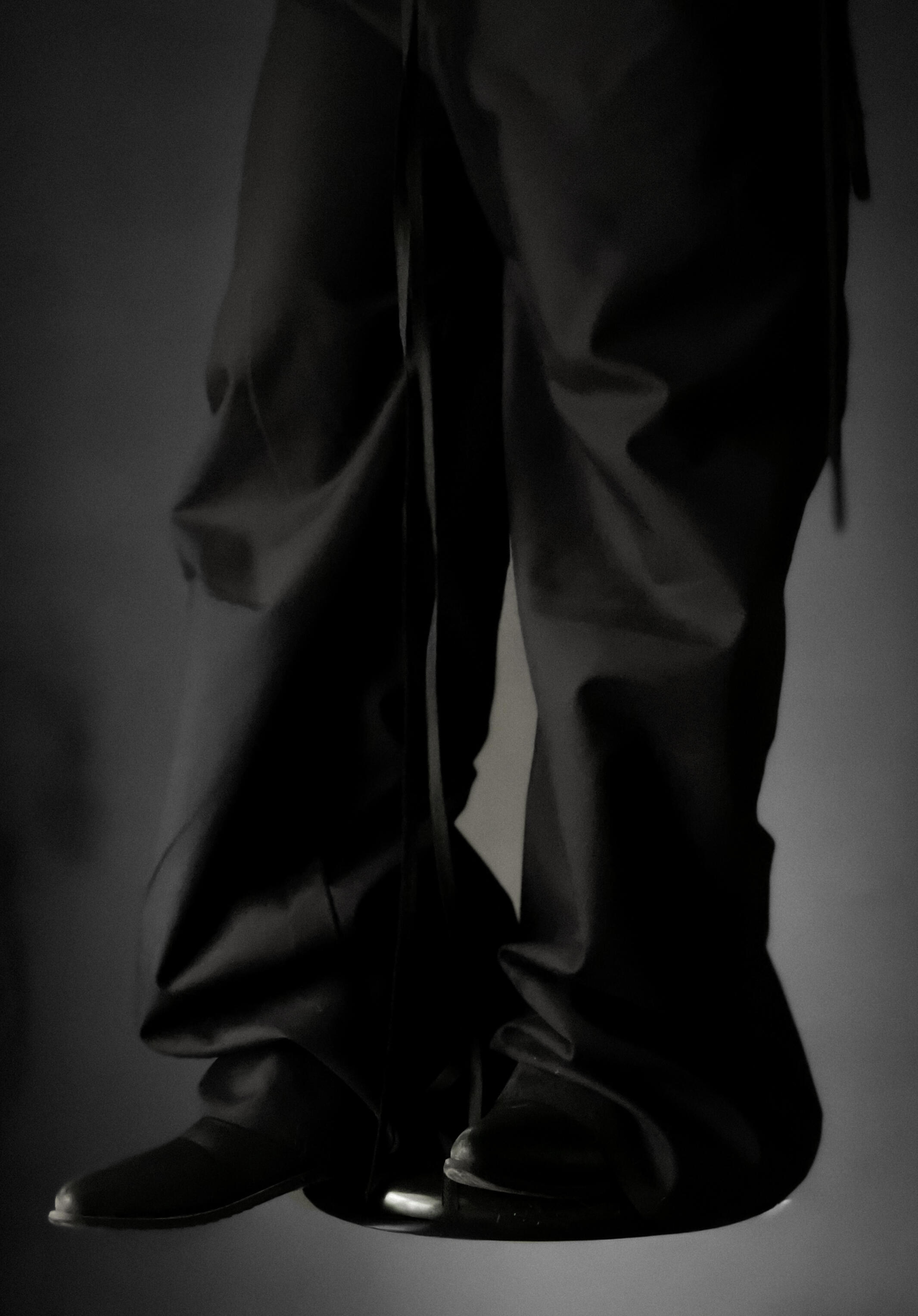 La pretina rodea el cuerpo cuando se anudan los lazos; el ruedo descansa sobre el suelo, dejando que la prenda se entregue a su propio peso.Es la sombra después del colapso, la forma que surge cuando todo exceso desaparece.