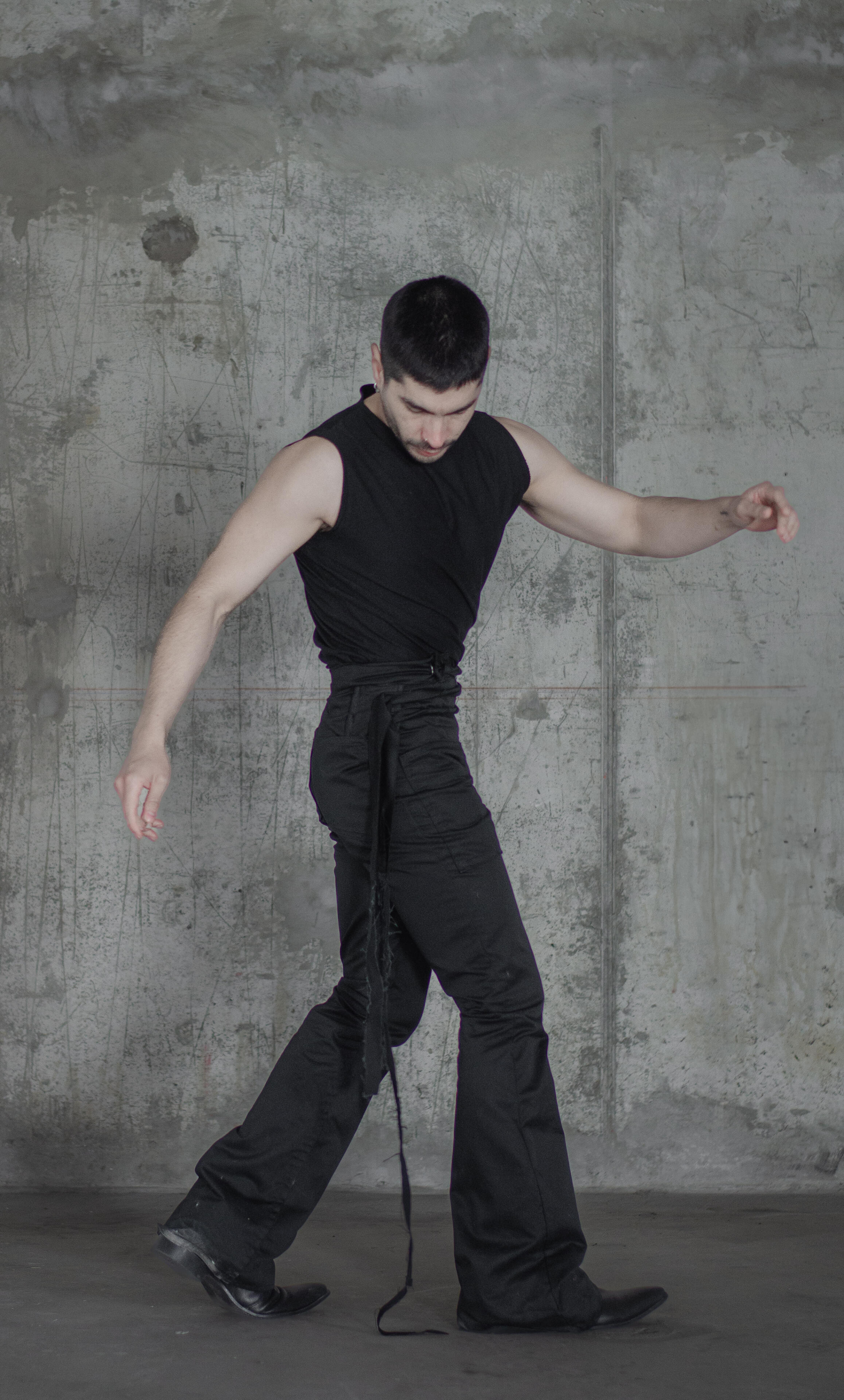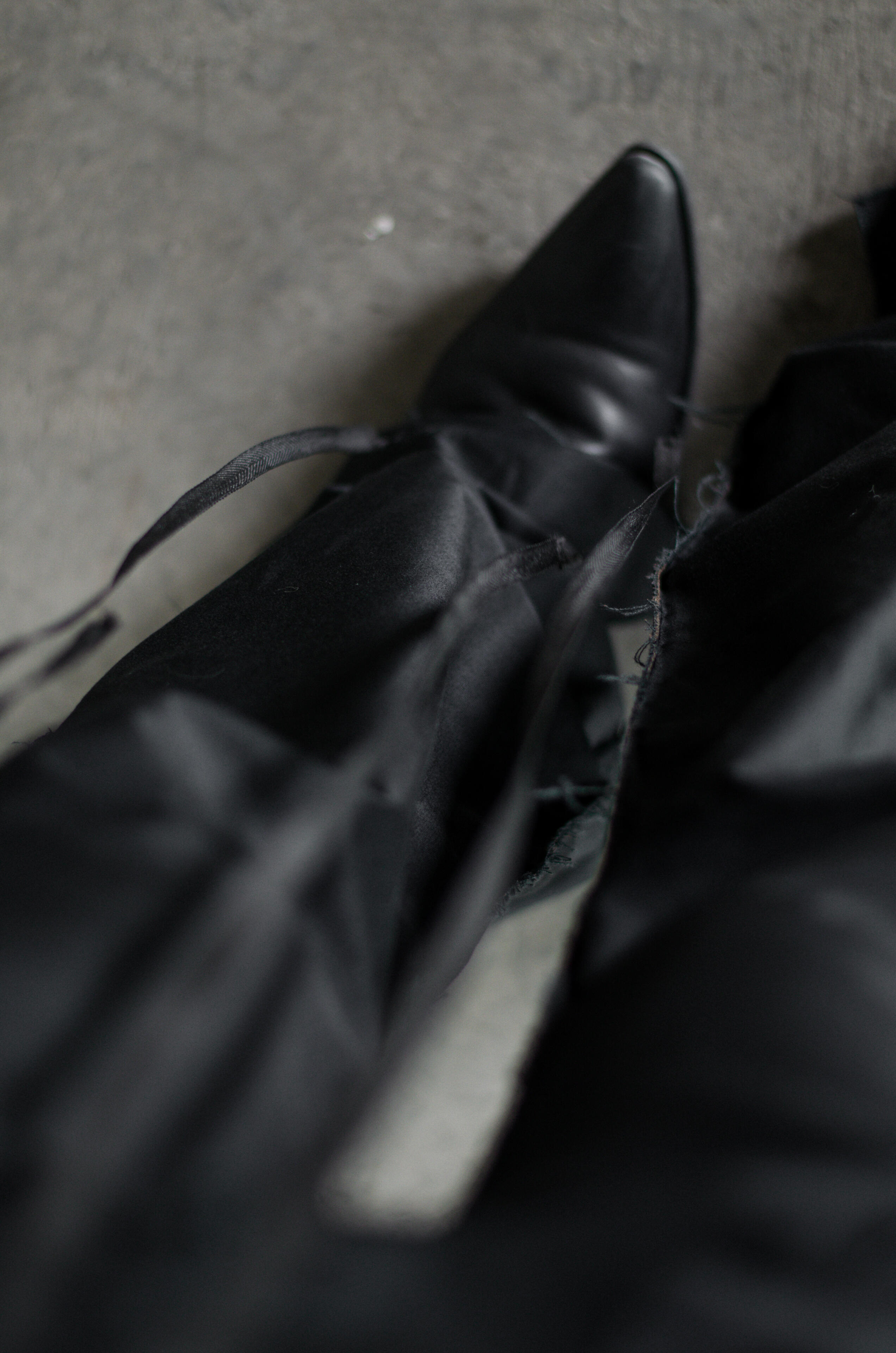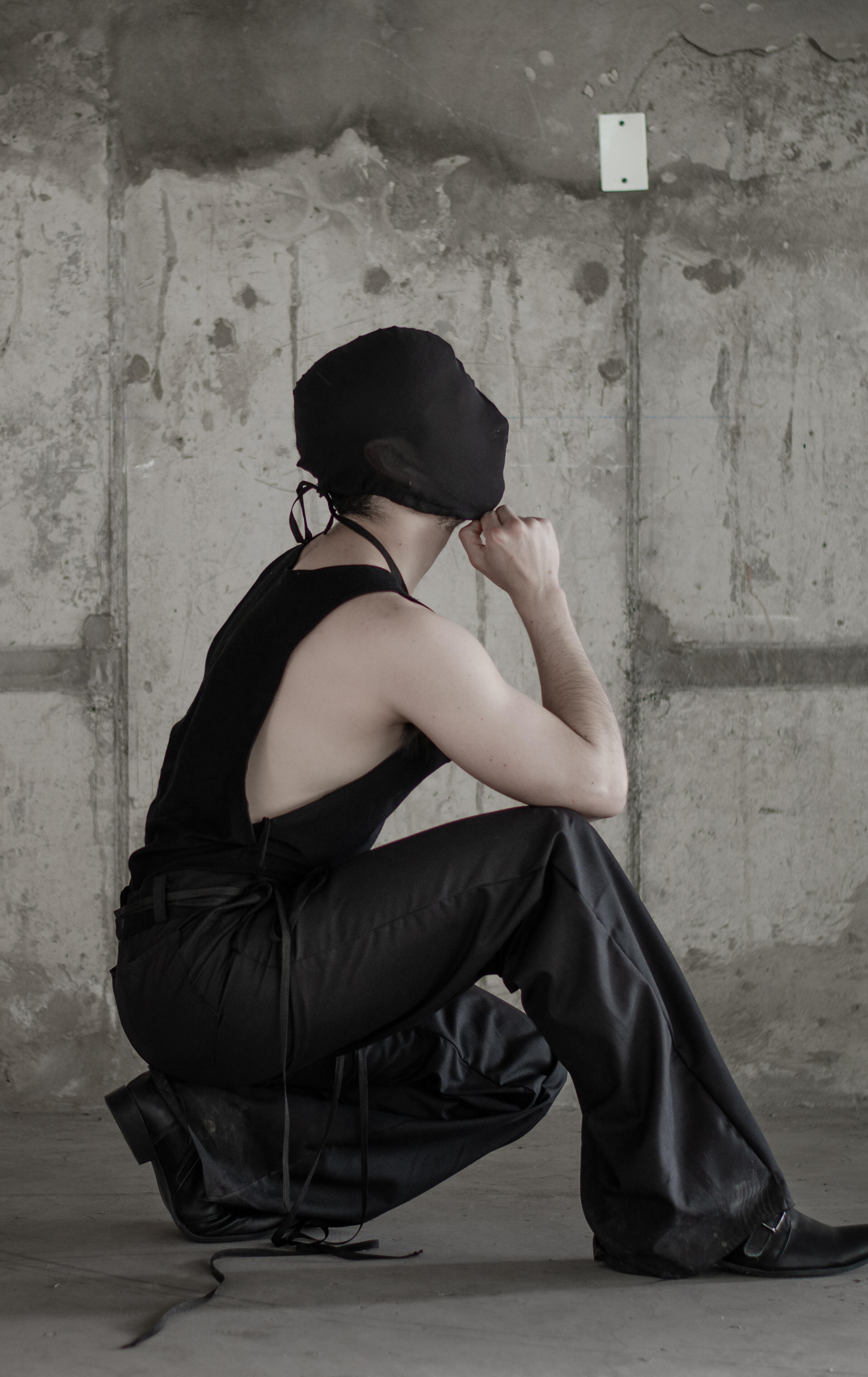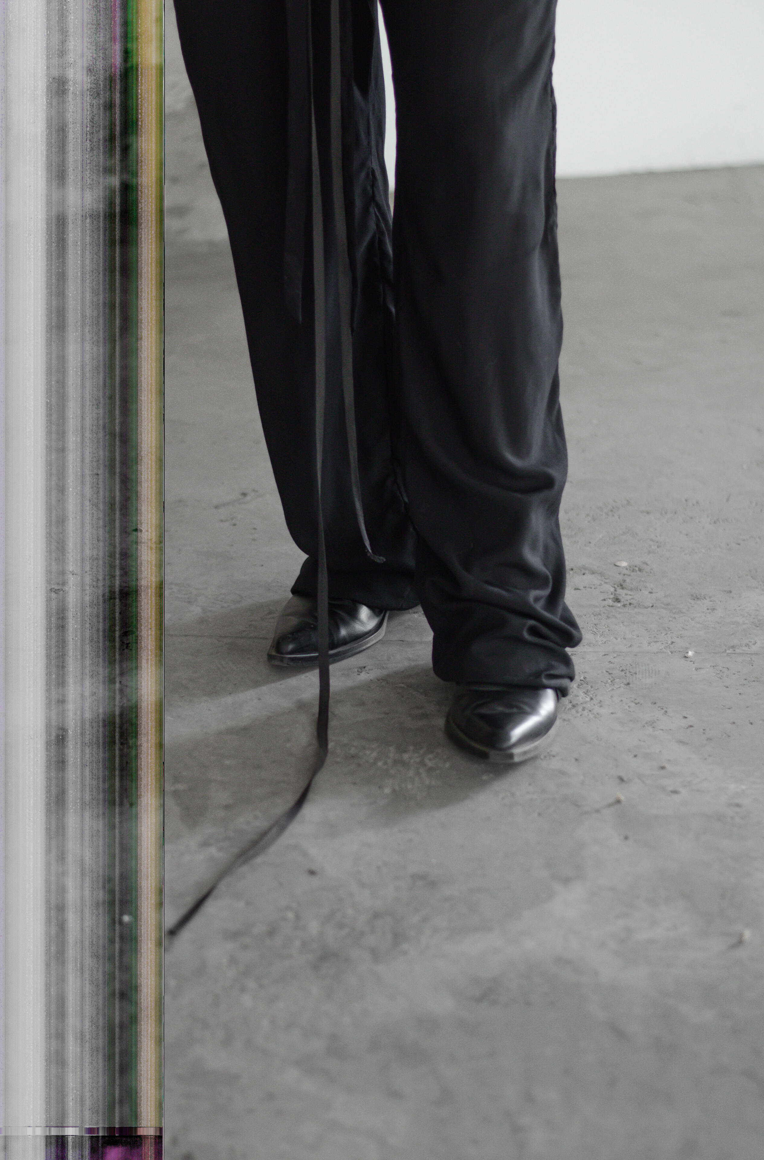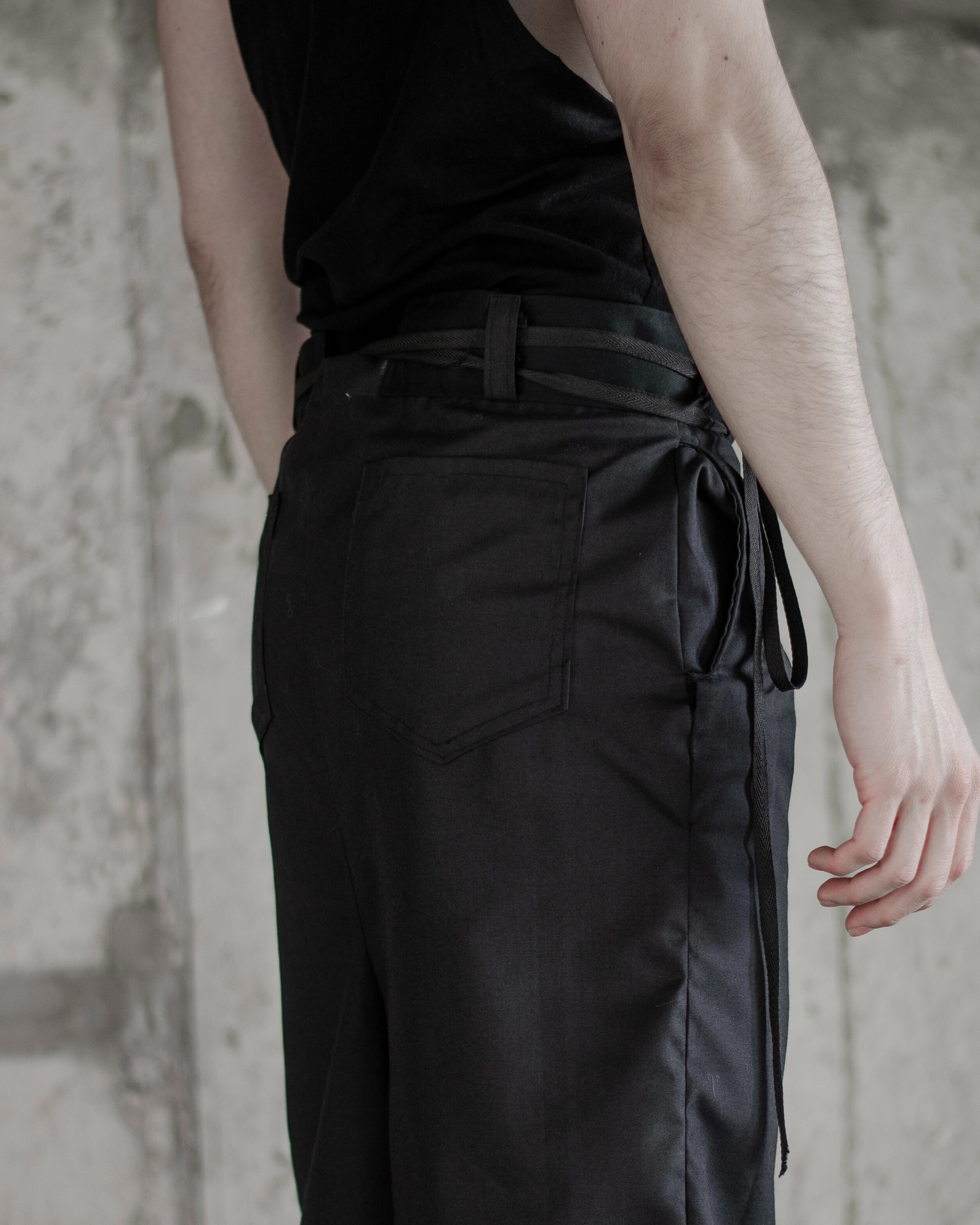 La pretina rodea el cuerpo cuando se anudan los lazos; el ruedo descansa sobre el suelo, dejando que la prenda se entregue a su propio peso.Es la sombra después del colapso, la forma que surge cuando todo exceso desaparece.