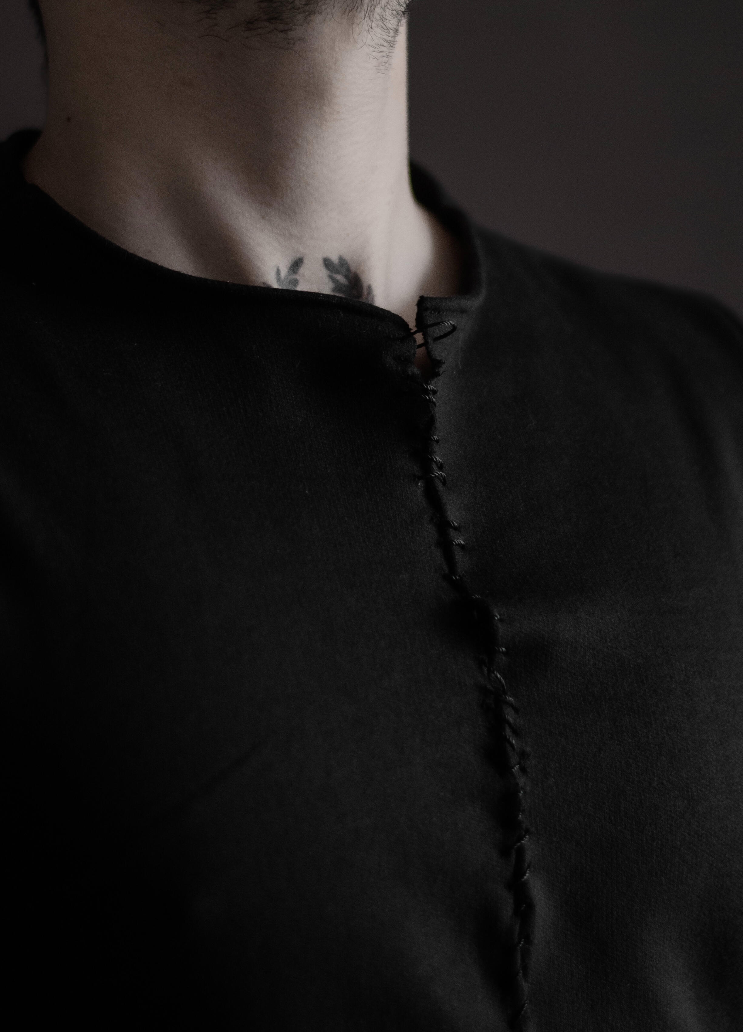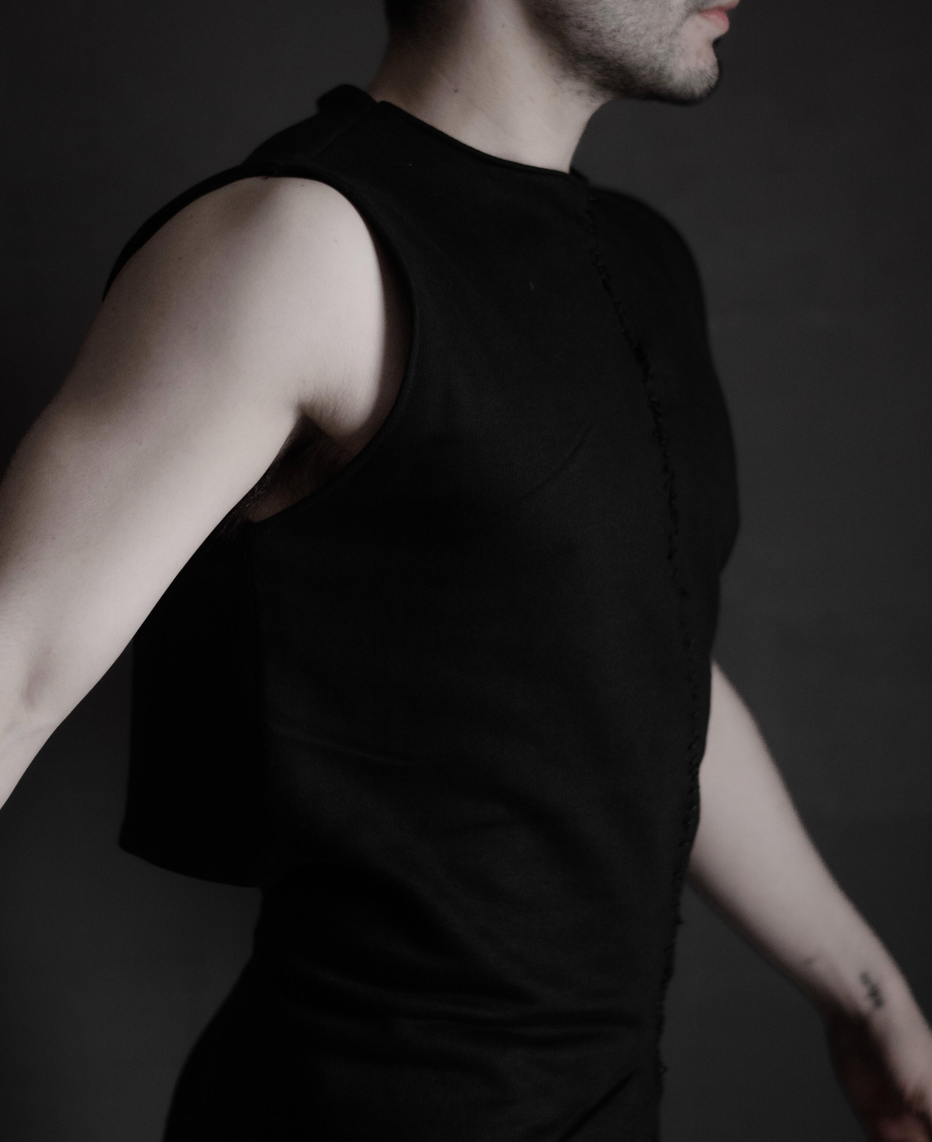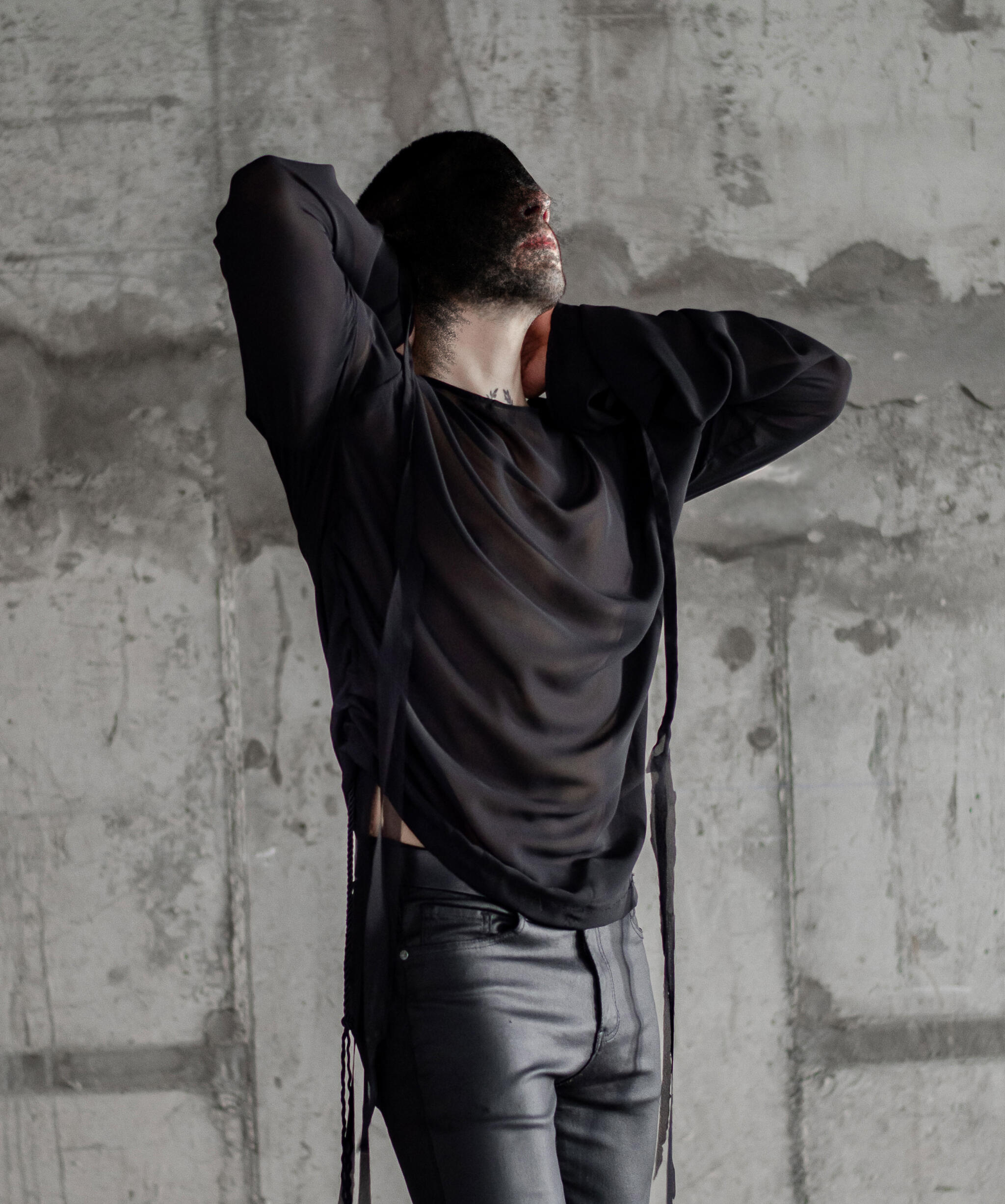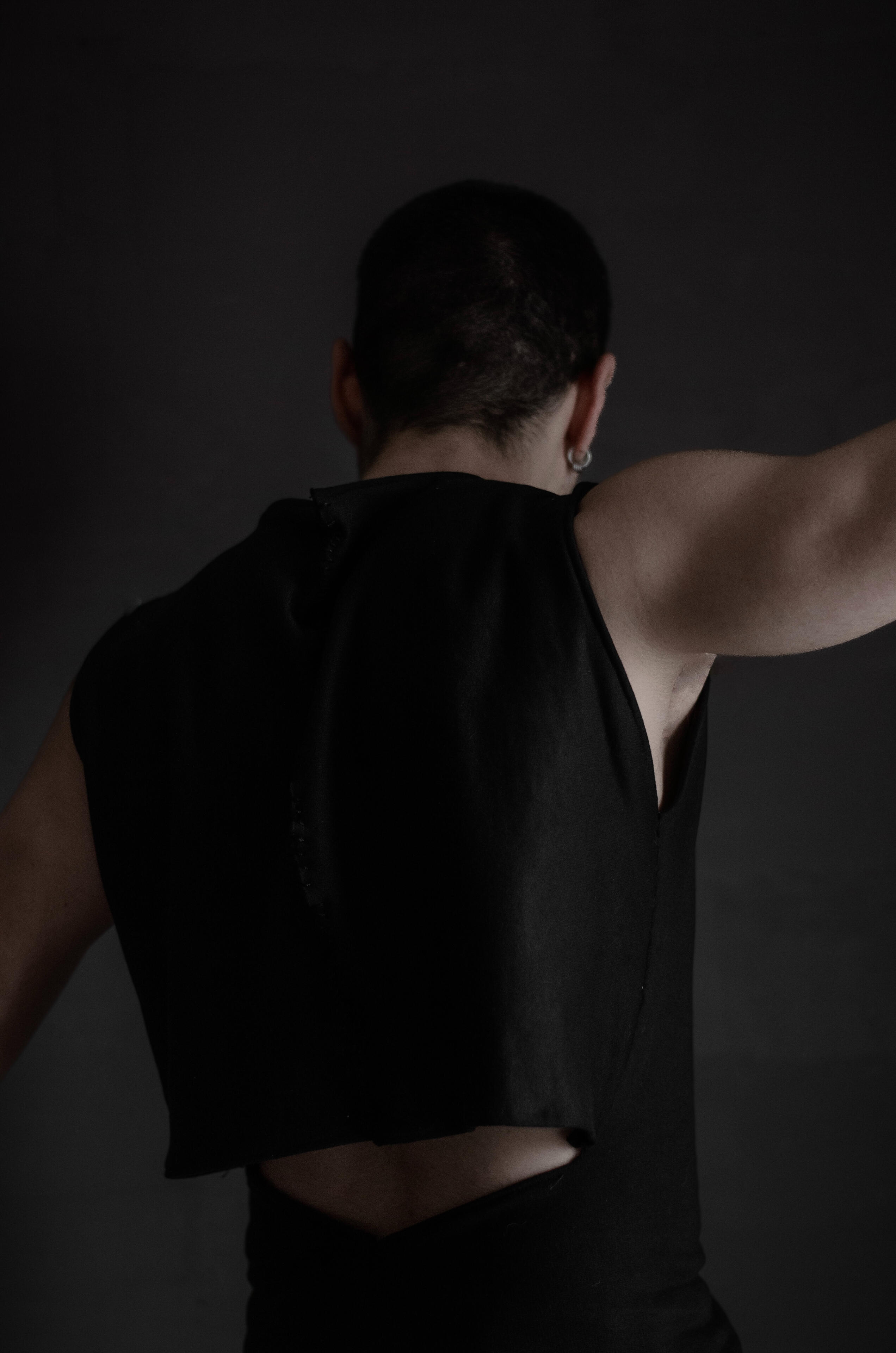 La pretina rodea el cuerpo cuando se anudan los lazos; el ruedo descansa sobre el suelo, dejando que la prenda se entregue a su propio peso.Es la sombra después del colapso, la forma que surge cuando todo exceso desaparece.
