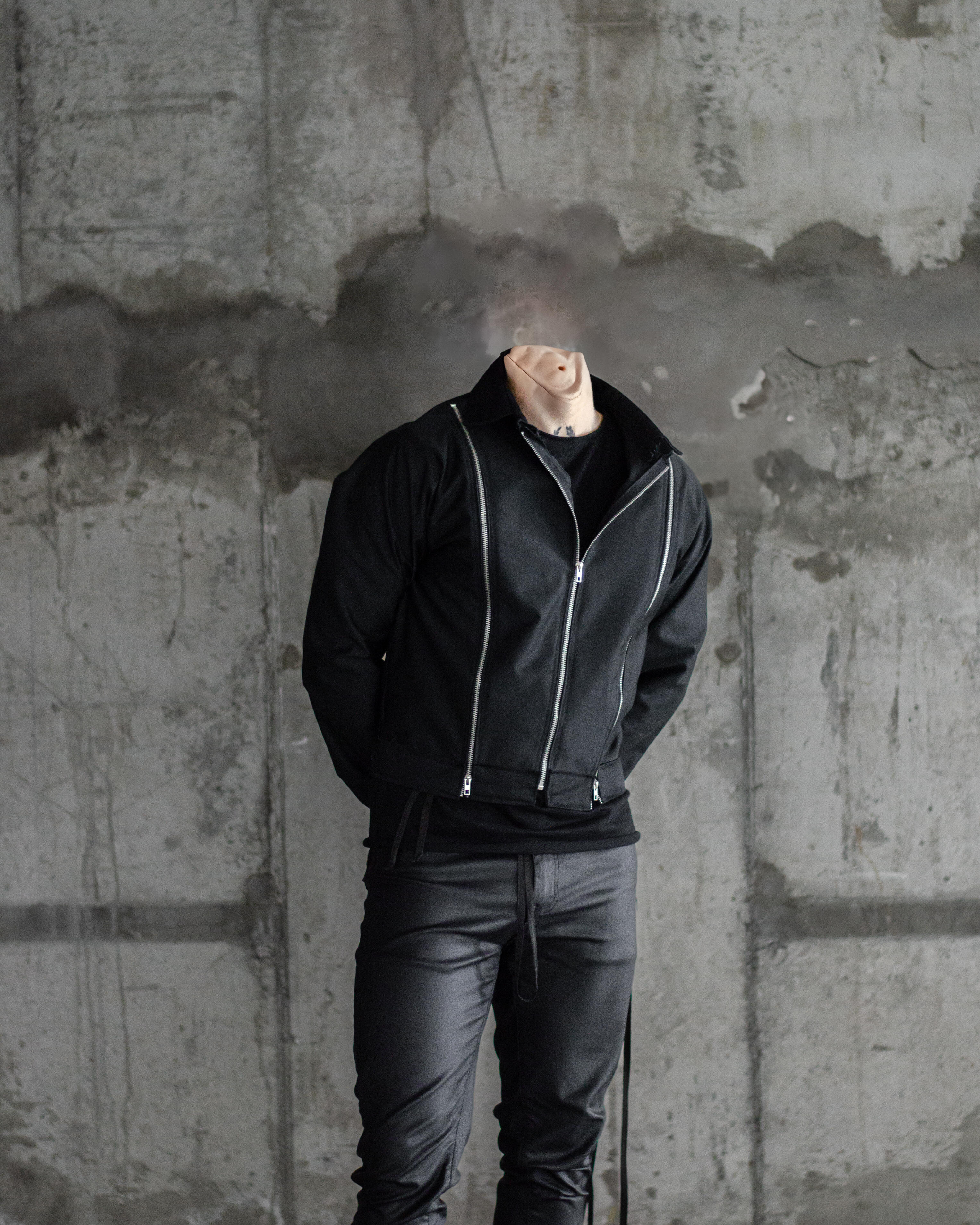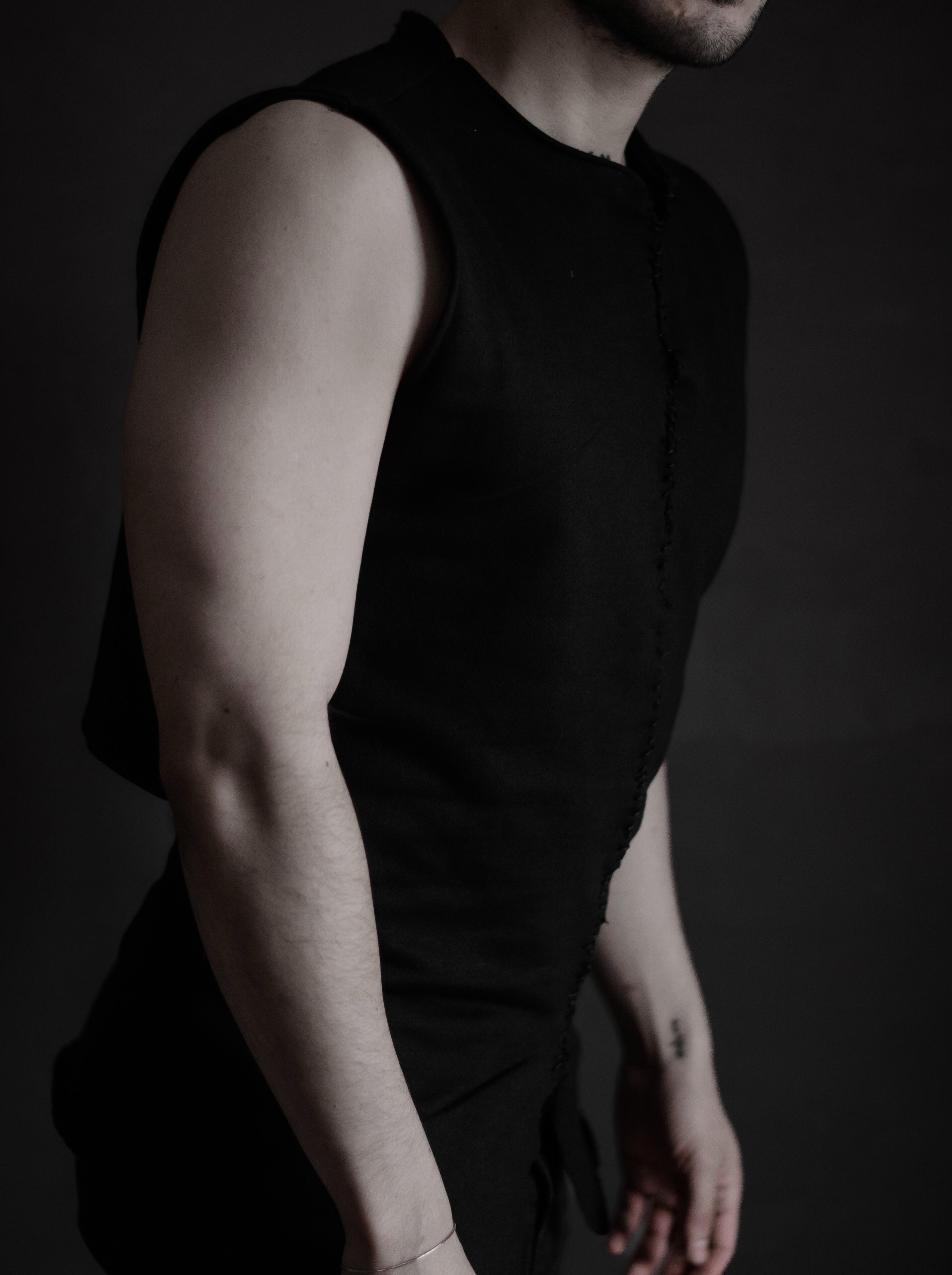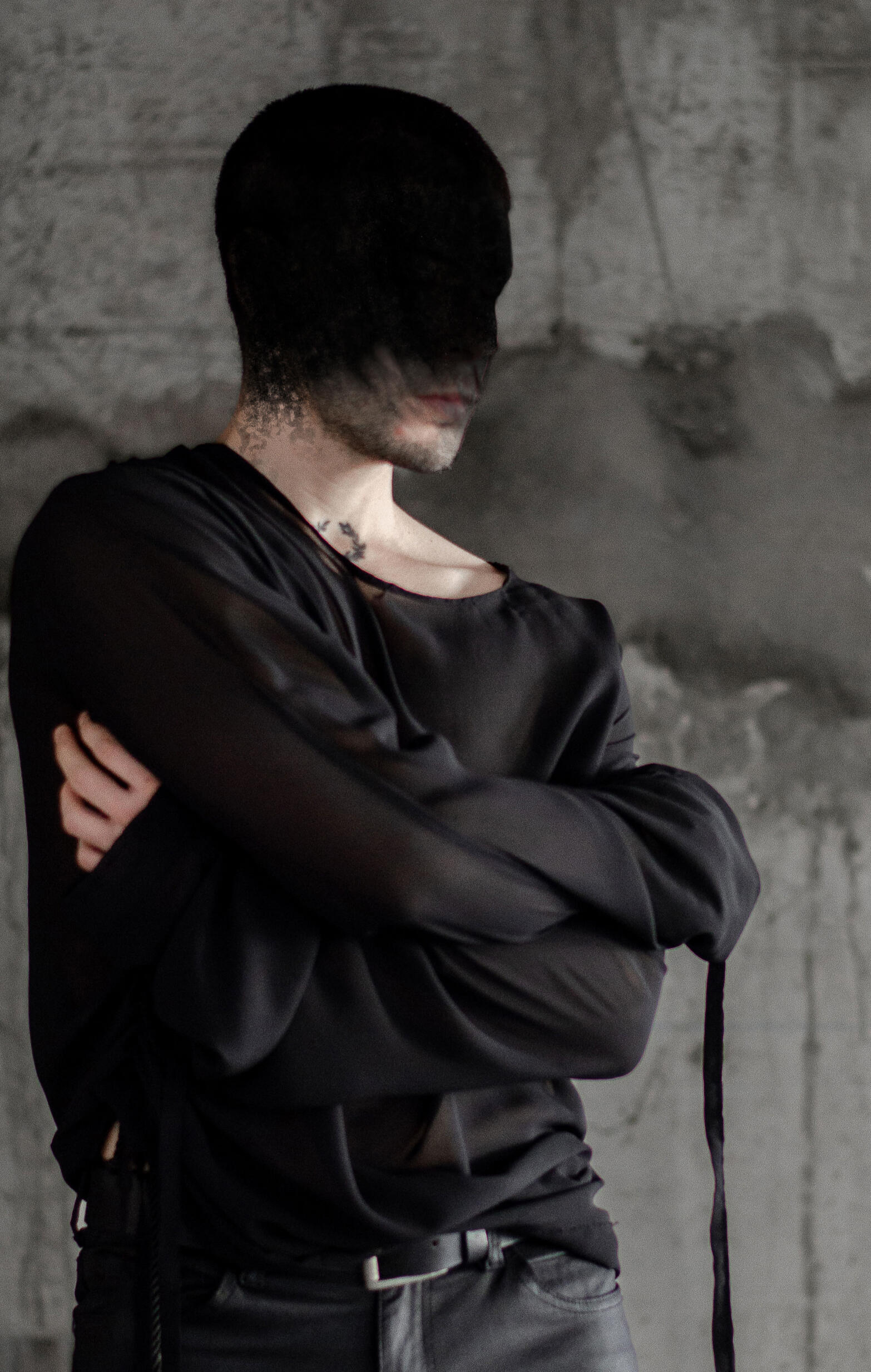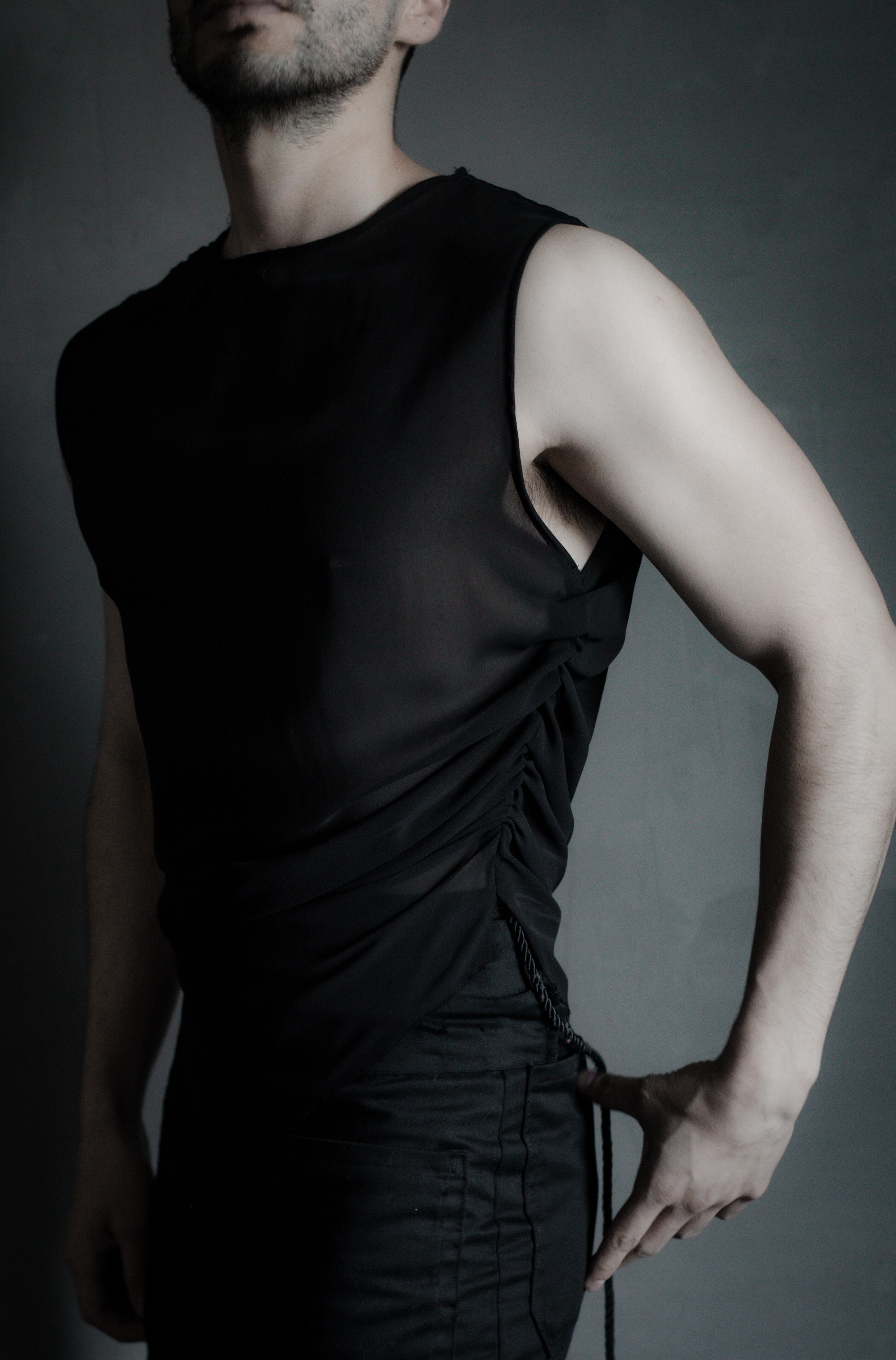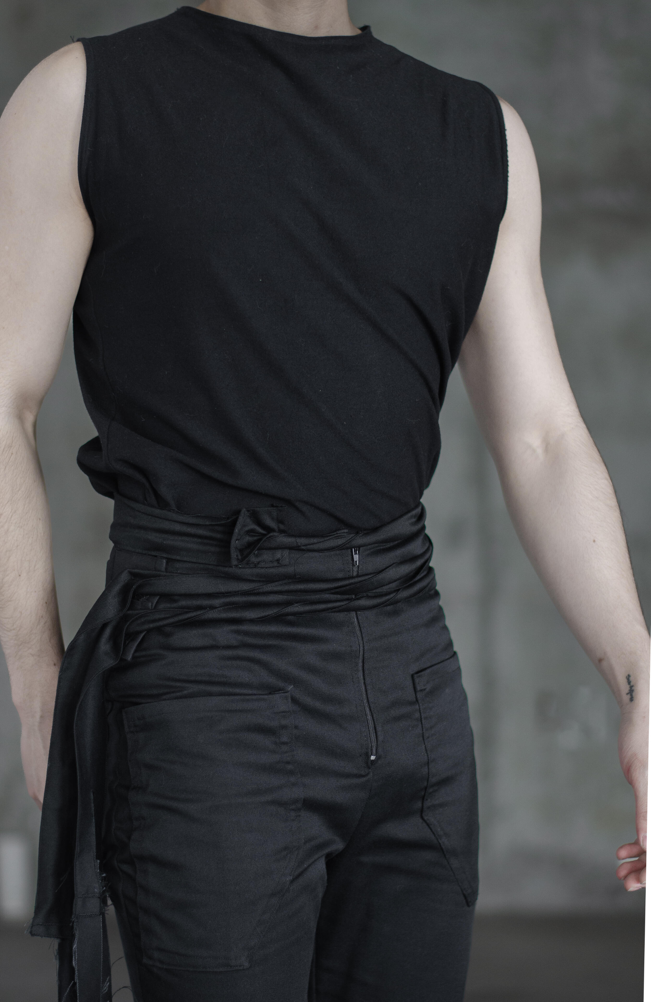 La pretina rodea el cuerpo cuando se anudan los lazos; el ruedo descansa sobre el suelo, dejando que la prenda se entregue a su propio peso.Es la sombra después del colapso, la forma que surge cuando todo exceso desaparece.