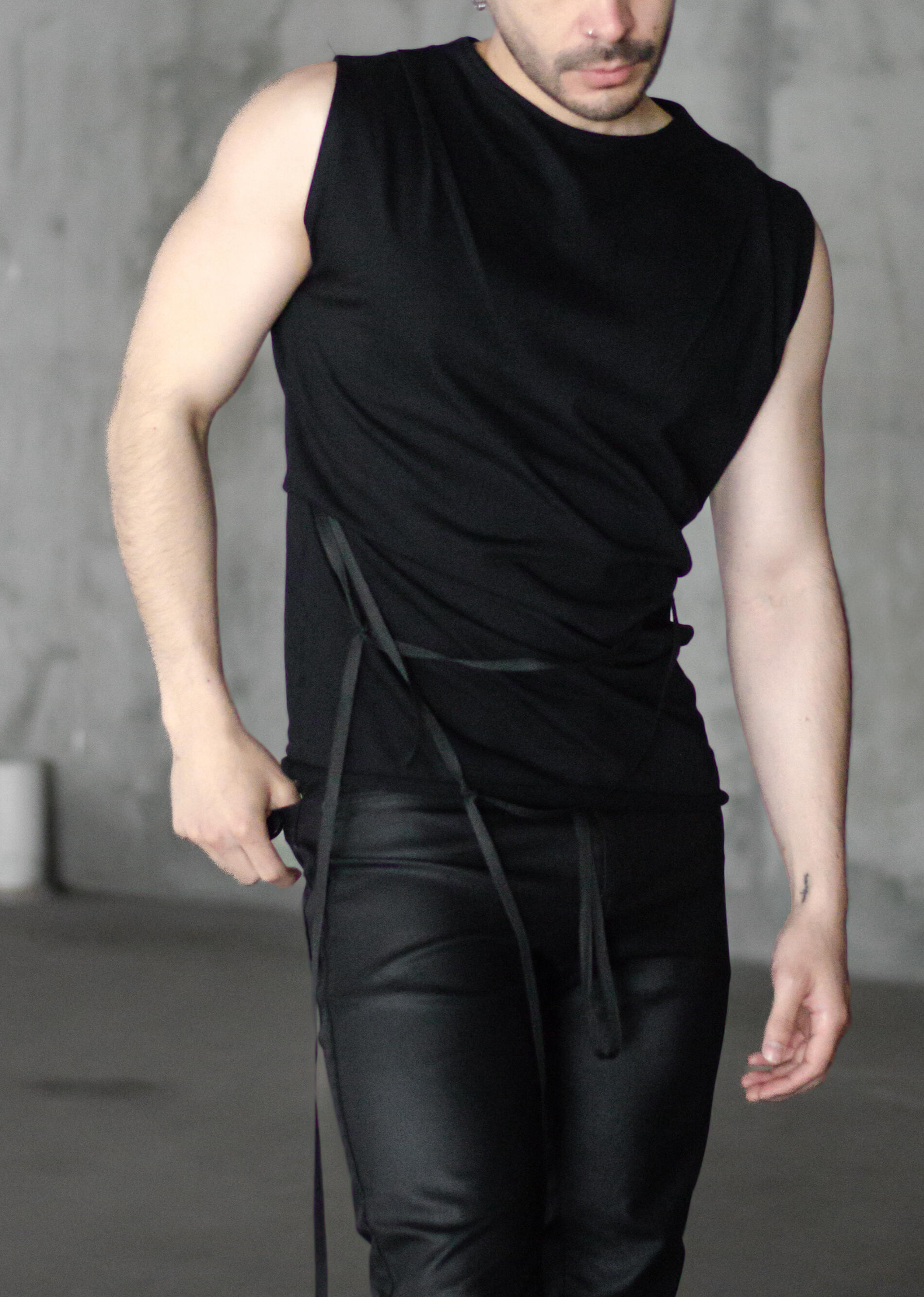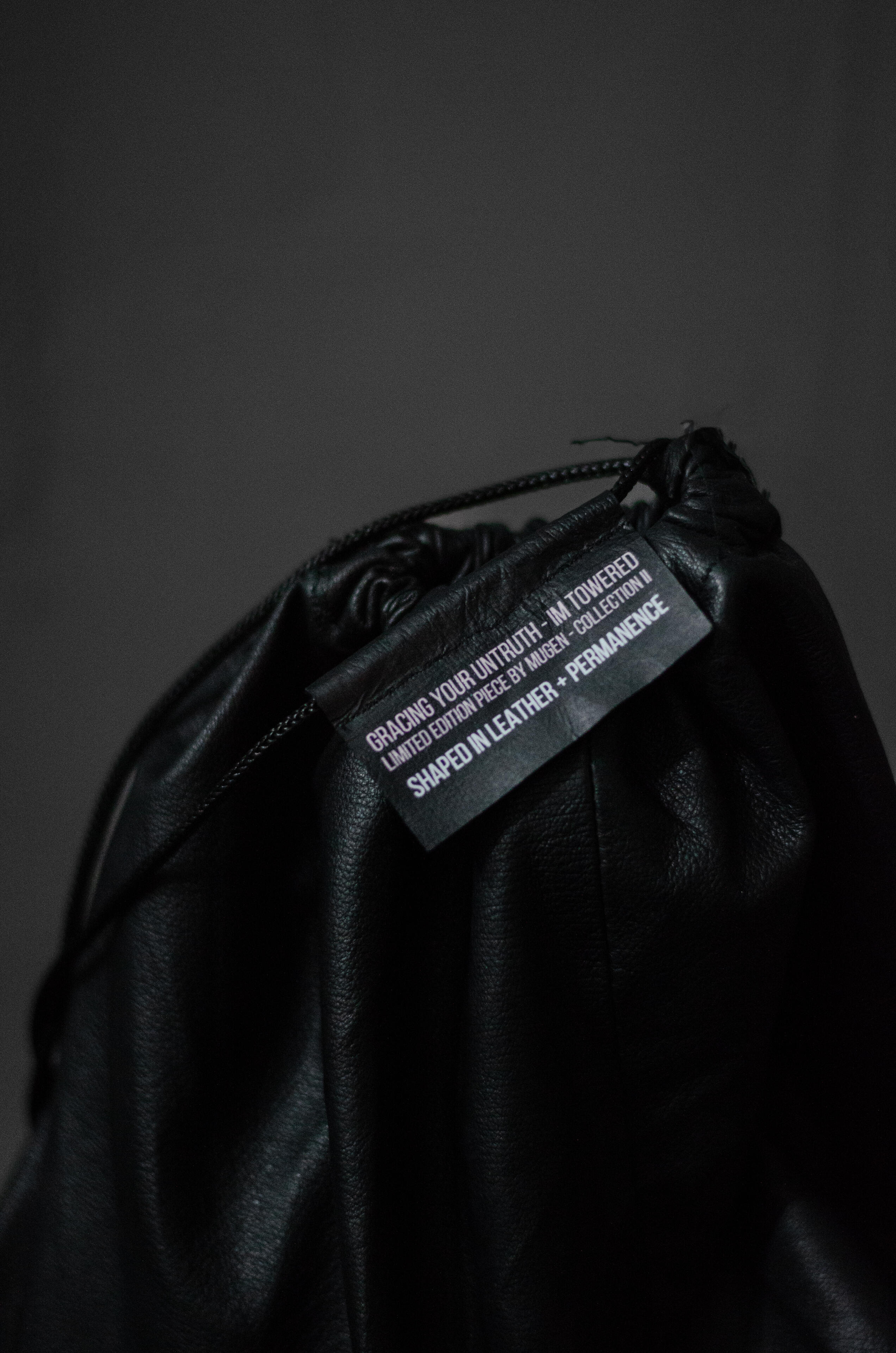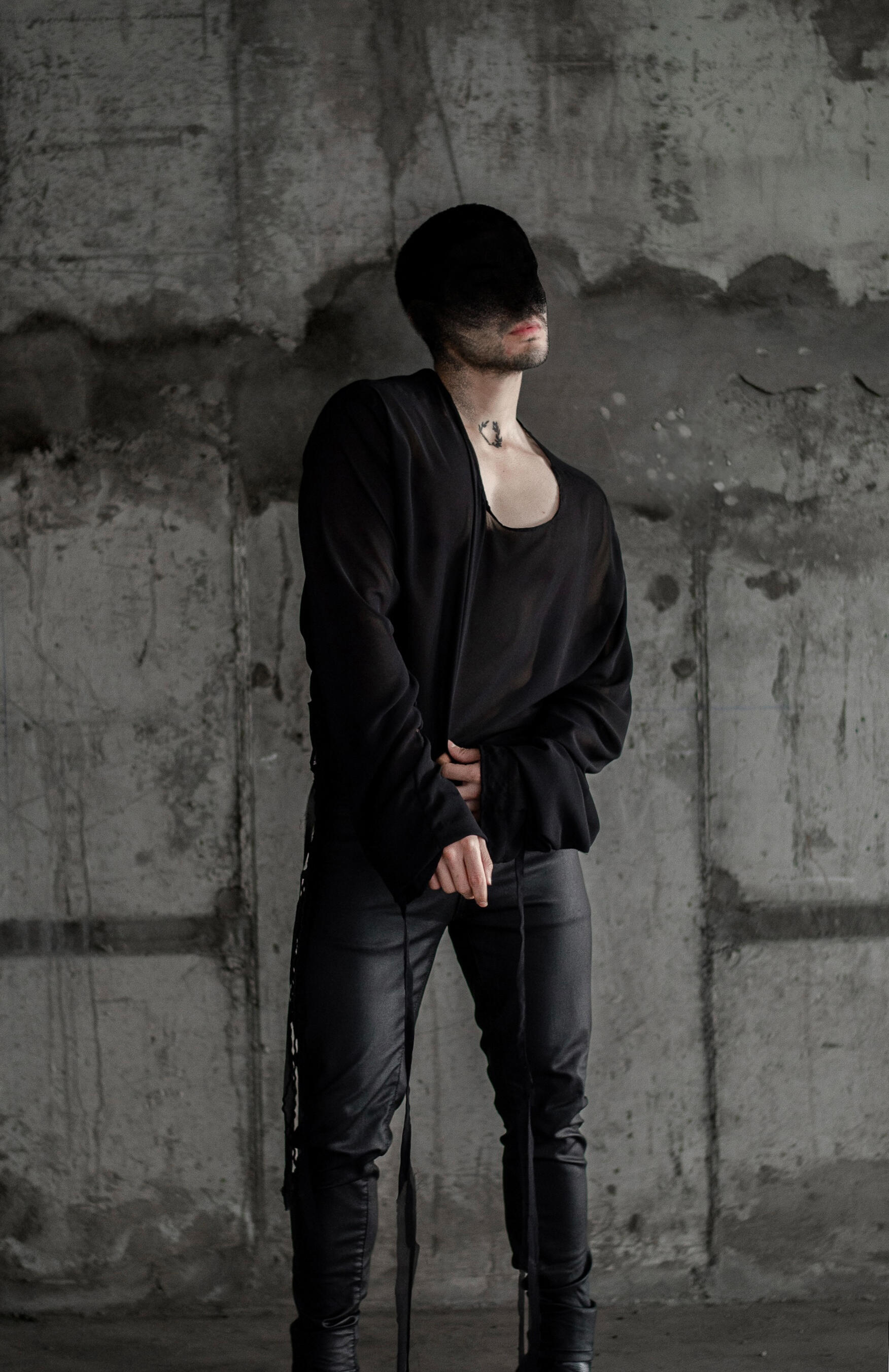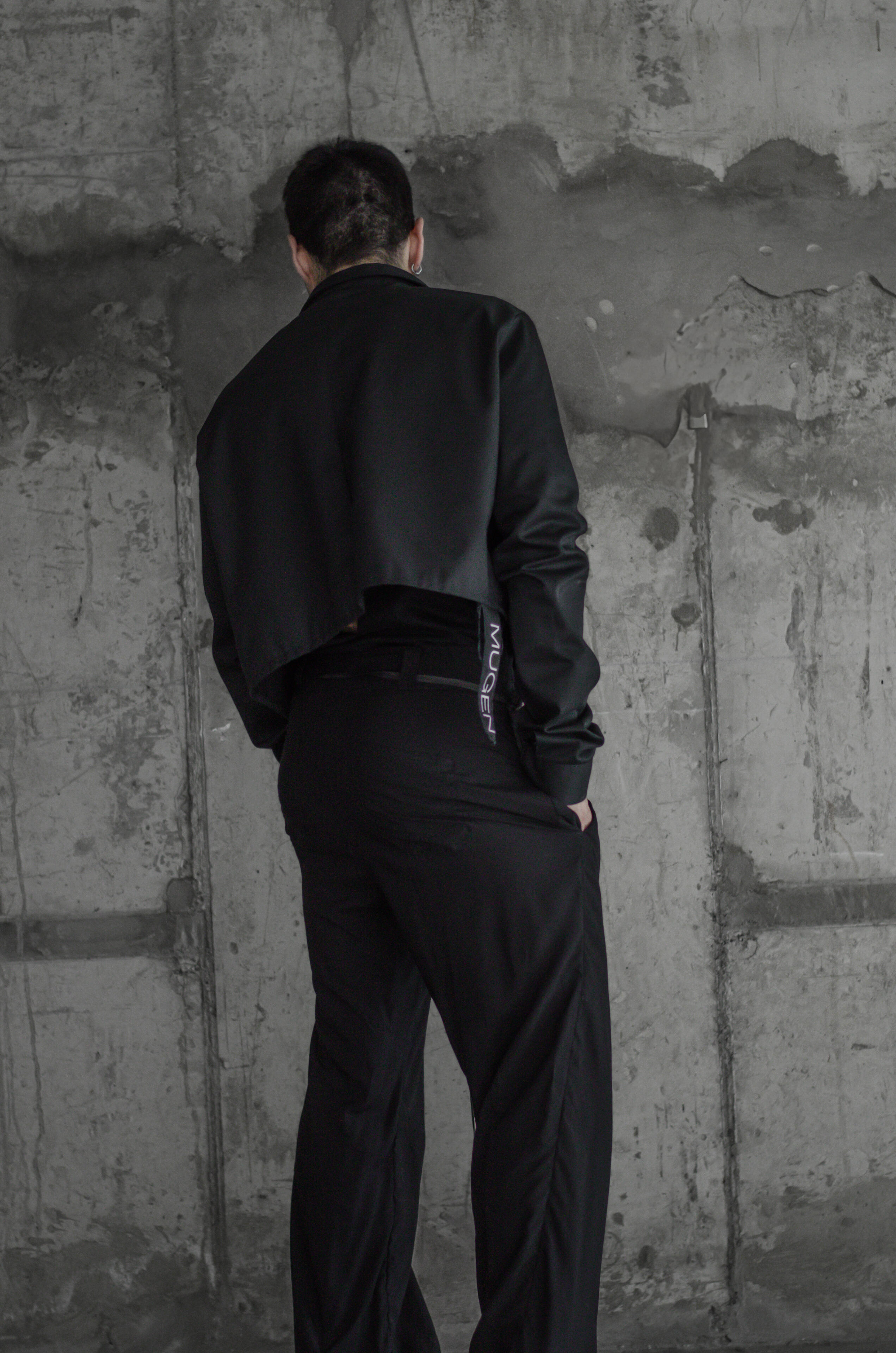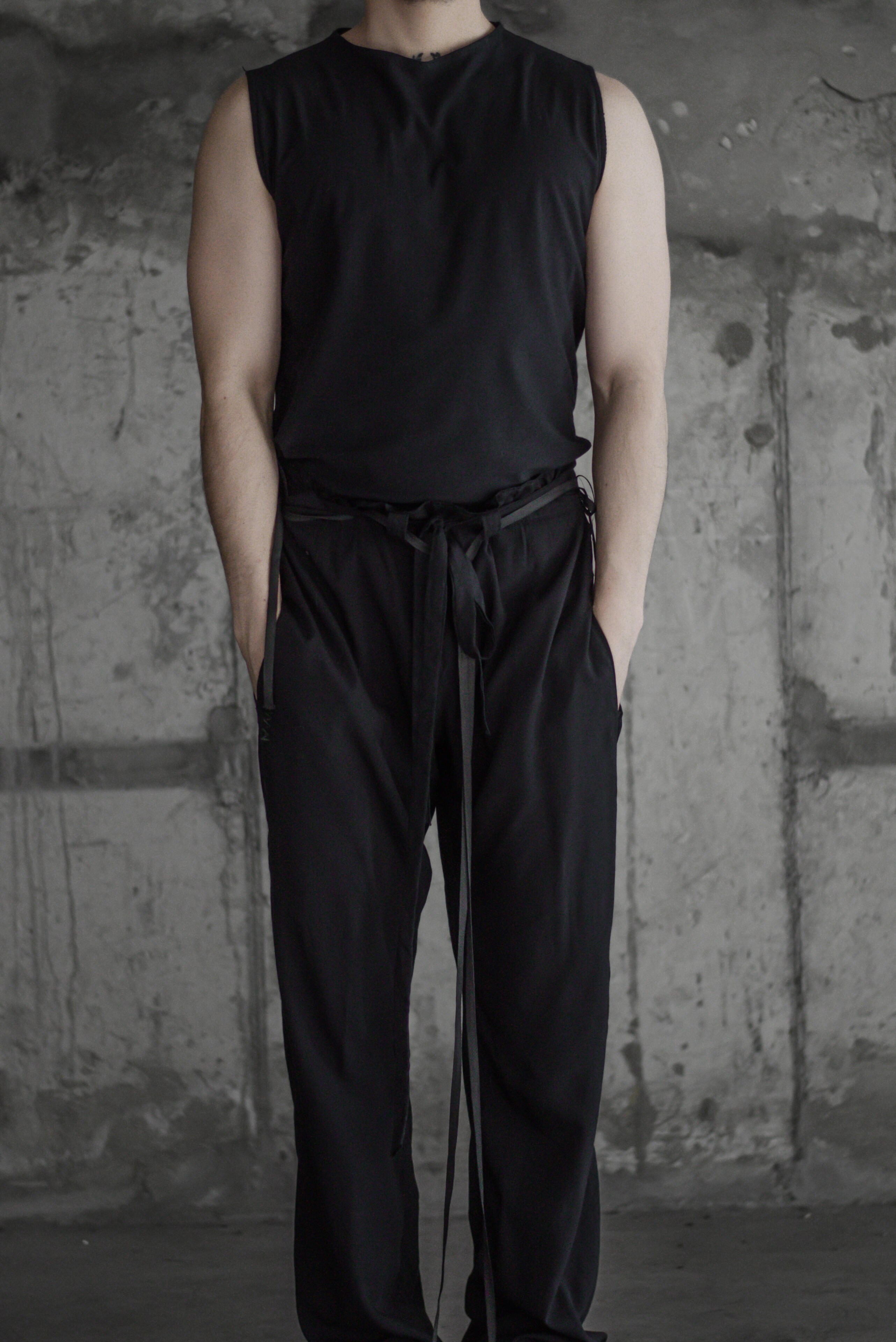 La pretina rodea el cuerpo cuando se anudan los lazos; el ruedo descansa sobre el suelo, dejando que la prenda se entregue a su propio peso.Es la sombra después del colapso, la forma que surge cuando todo exceso desaparece.