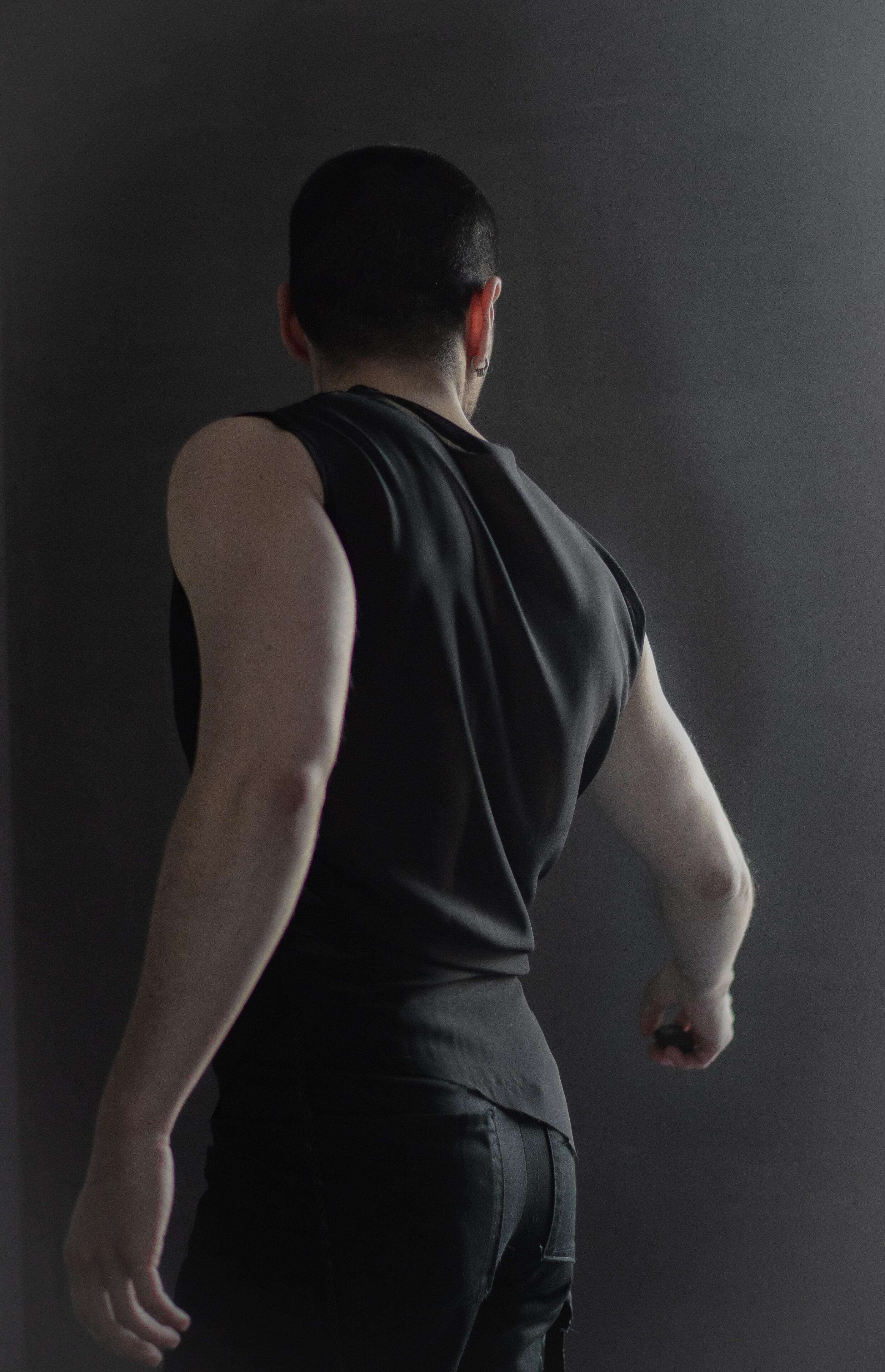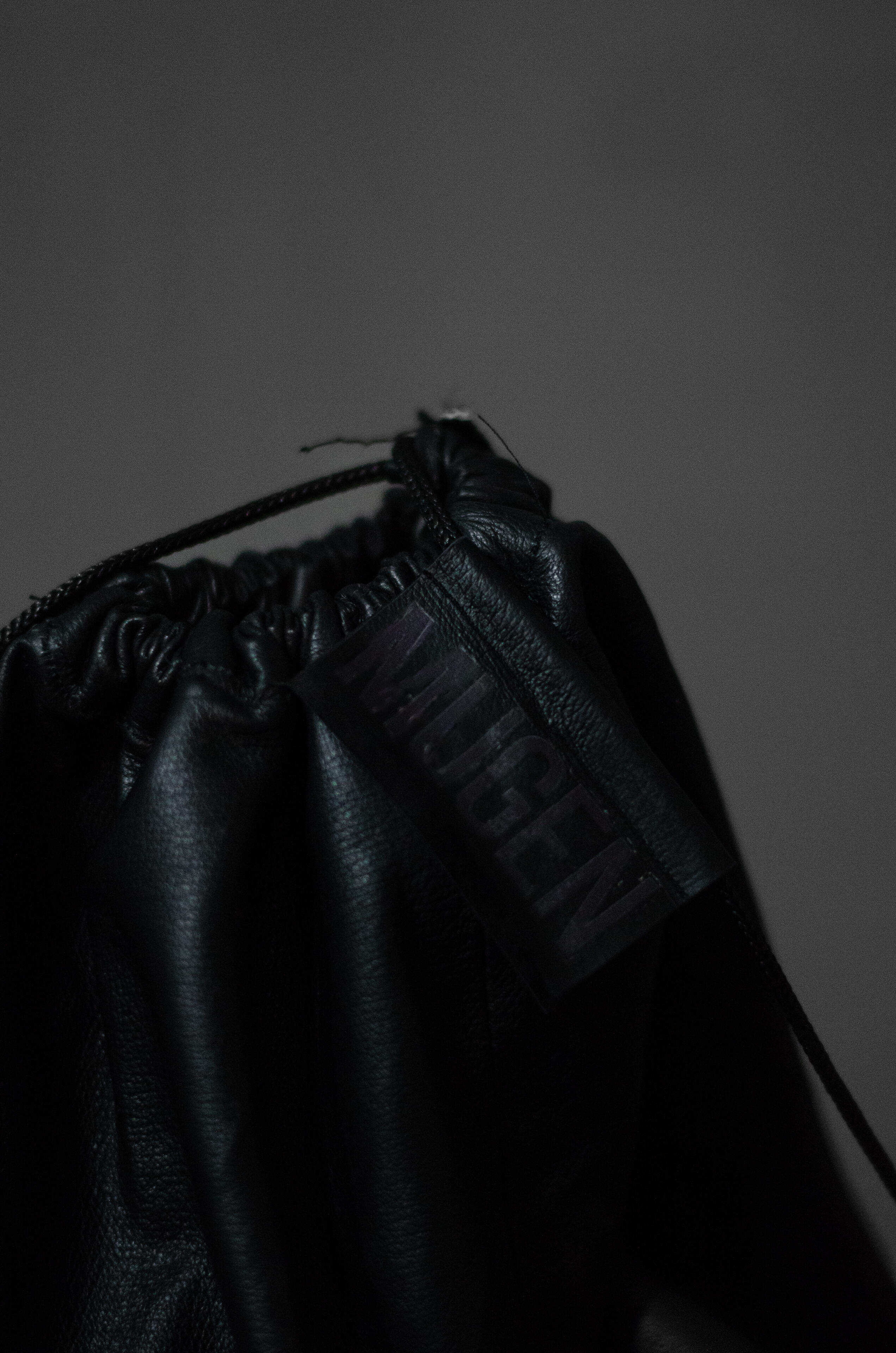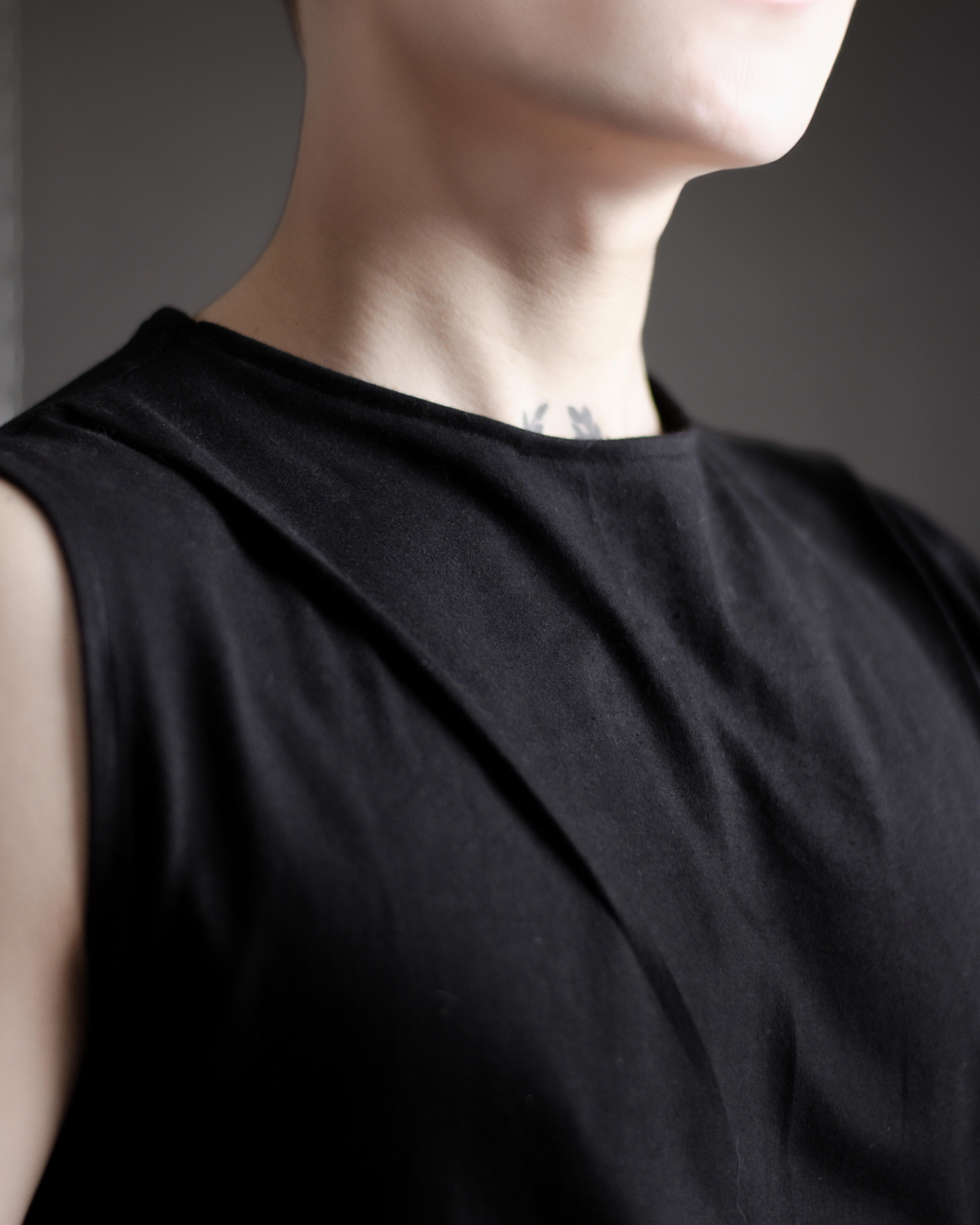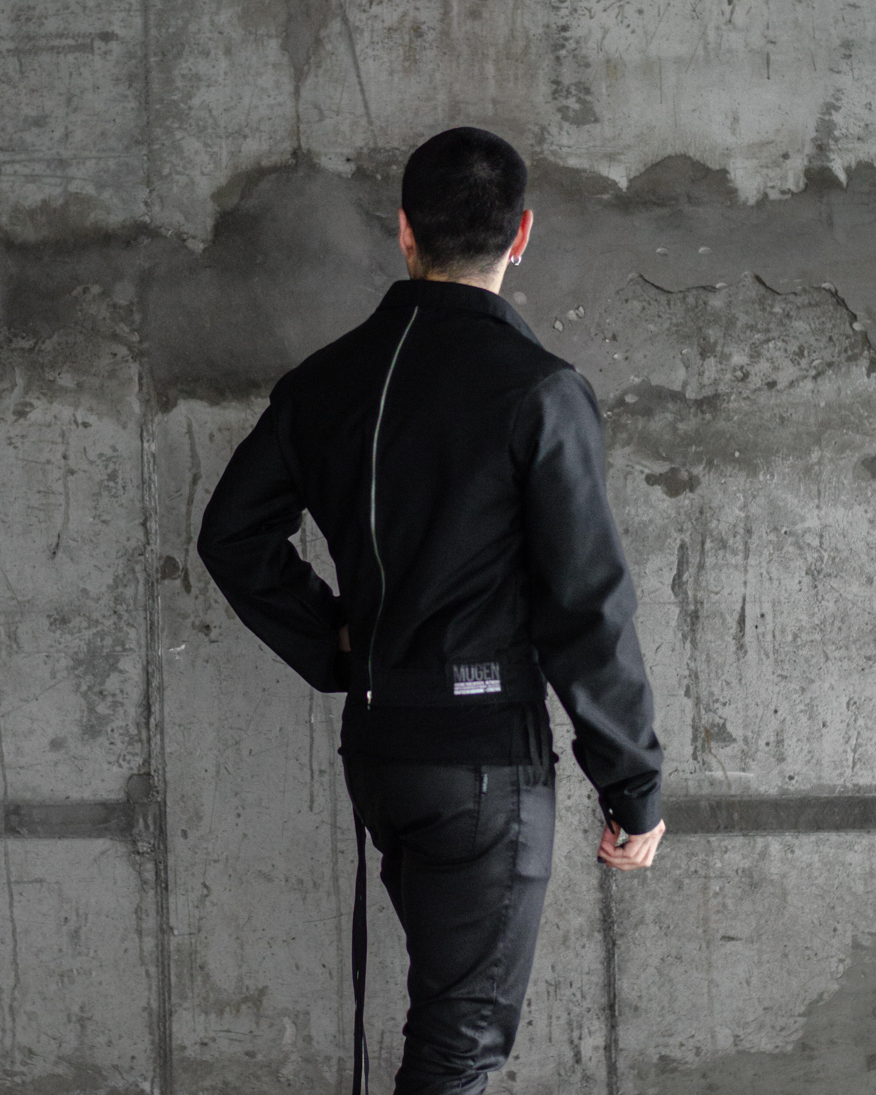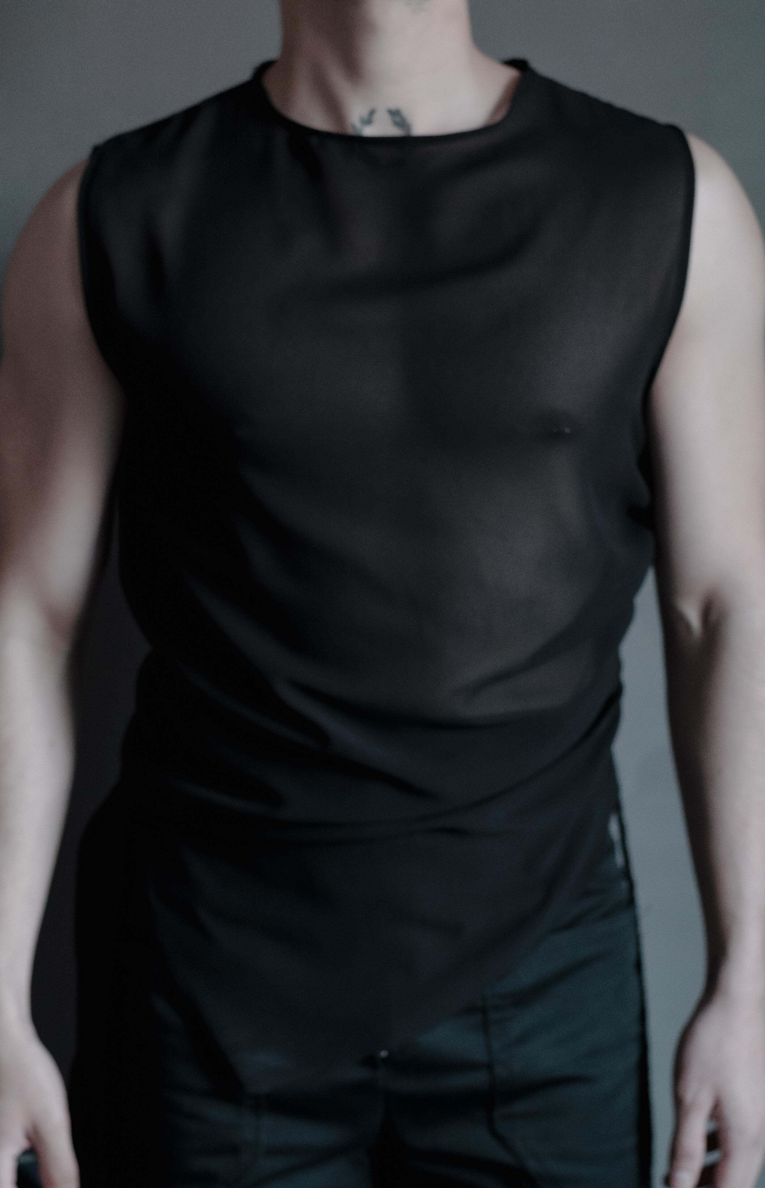 La pretina rodea el cuerpo cuando se anudan los lazos; el ruedo descansa sobre el suelo, dejando que la prenda se entregue a su propio peso.Es la sombra después del colapso, la forma que surge cuando todo exceso desaparece.