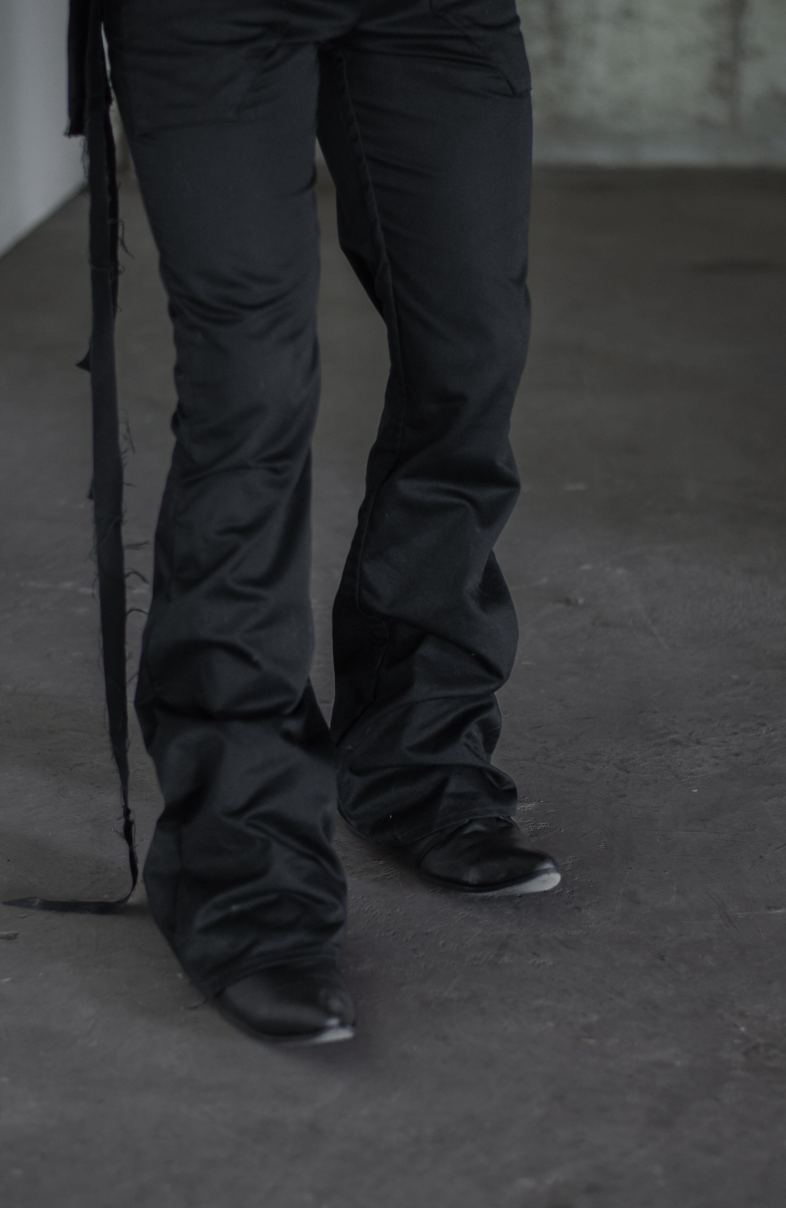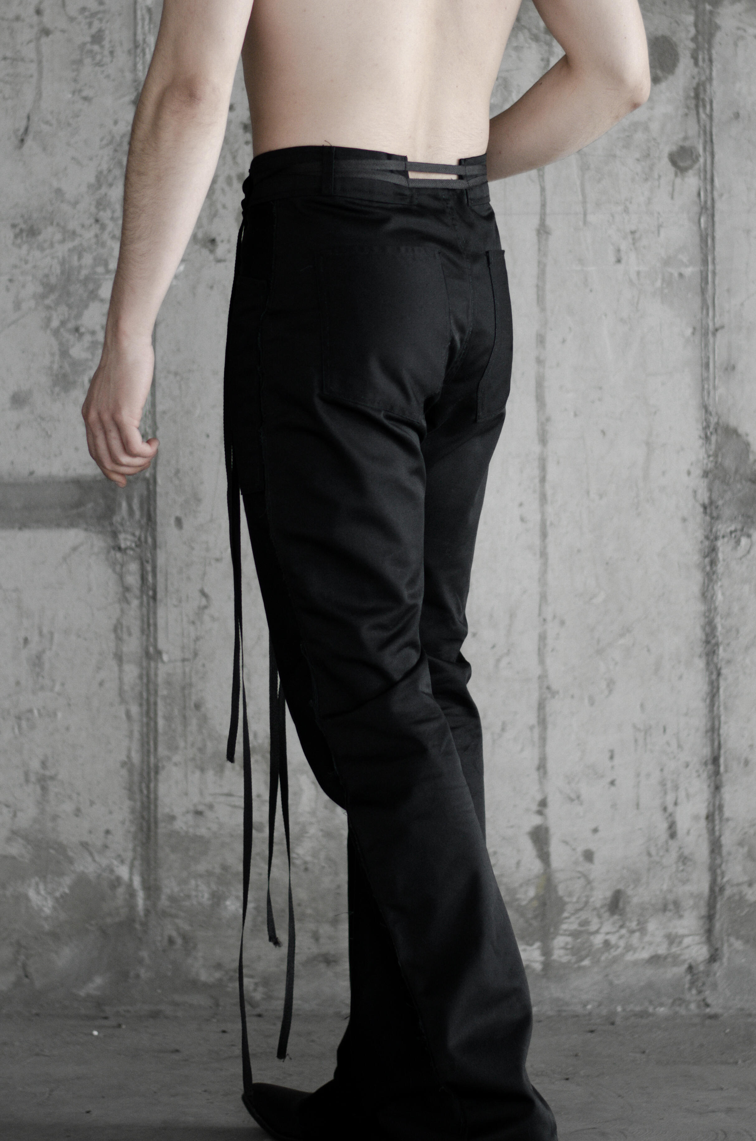 La pretina elevada estructura la silueta y las costuras laterales expuestas definen el carácter crudo de la pieza.